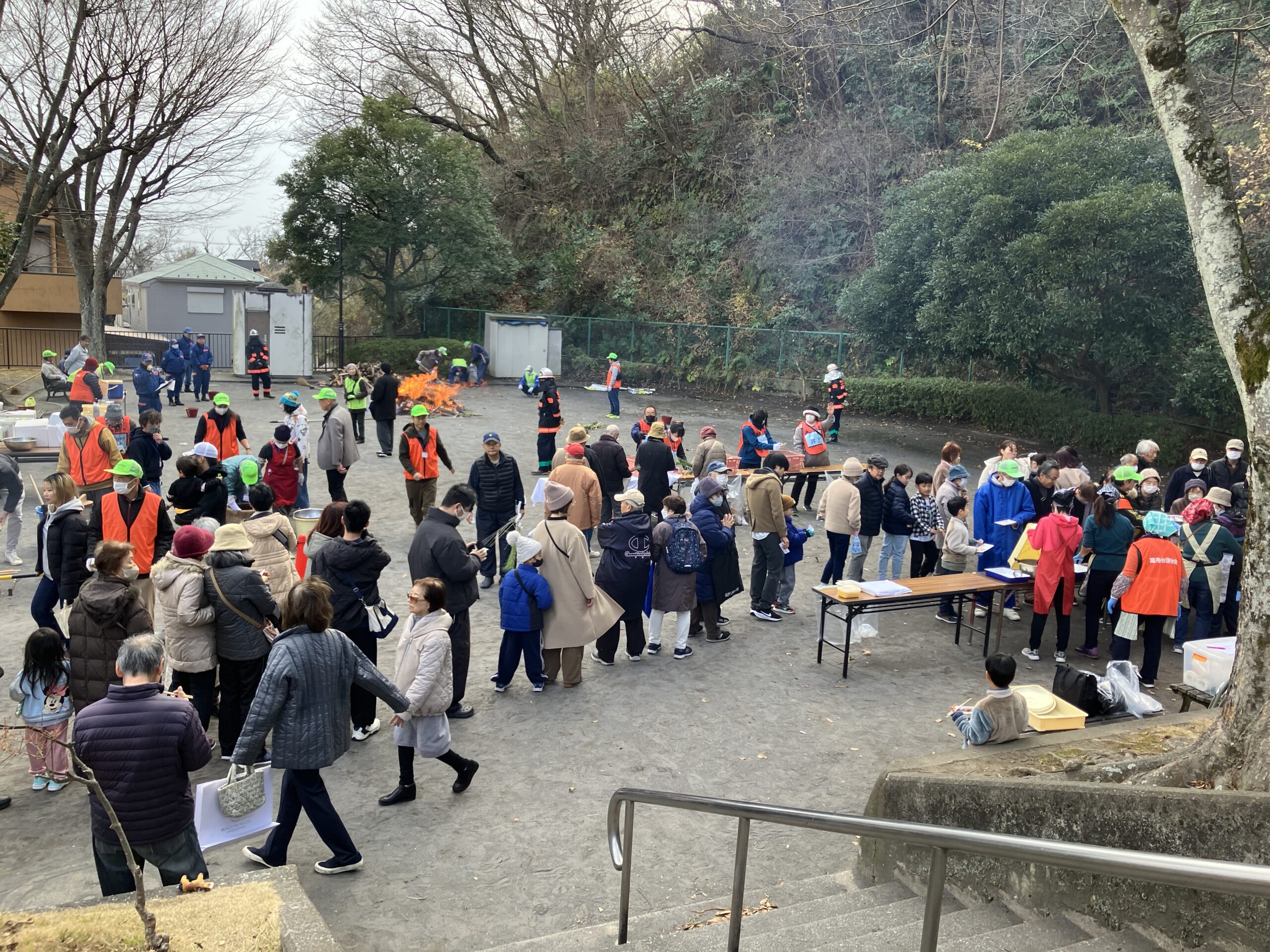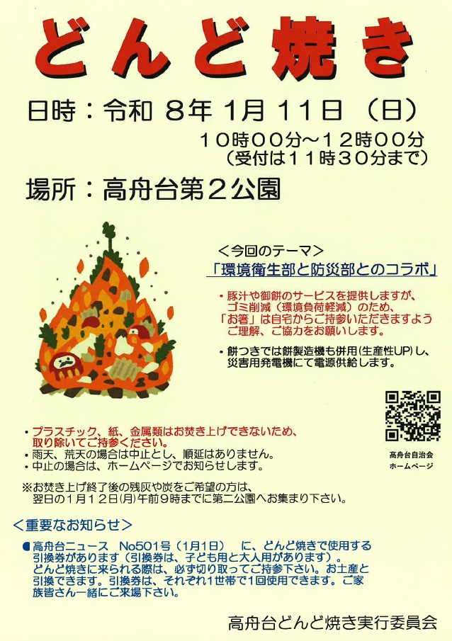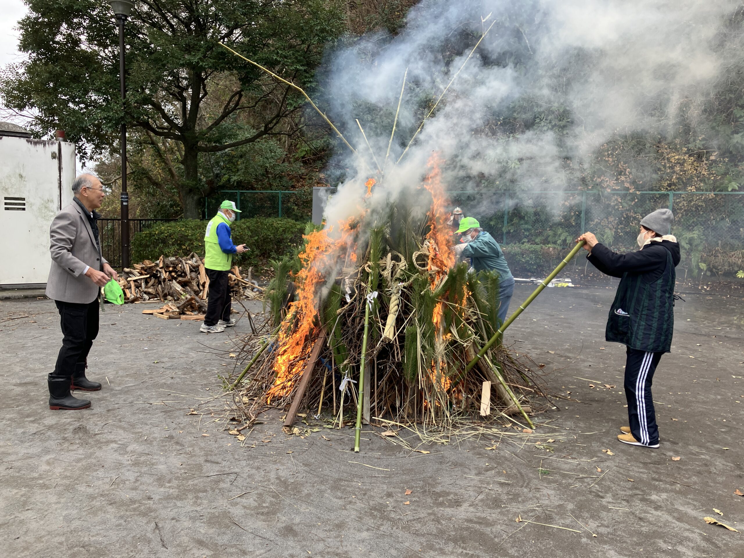 1月11日、高舟台第2公園で行われたどんど焼きに行ってきました。前日は強風が吹いていましたので心配していましたが、近隣の消防団の方々が見守る中、門松や松飾りのお焚き上げは無事に、滞りなく行われました。運営された皆さんは、周囲の木々に事前に水をまいたり、松飾りの紙は舞い上がるため燃やさなかったりと、かなり慎重に対応されていたようです。
