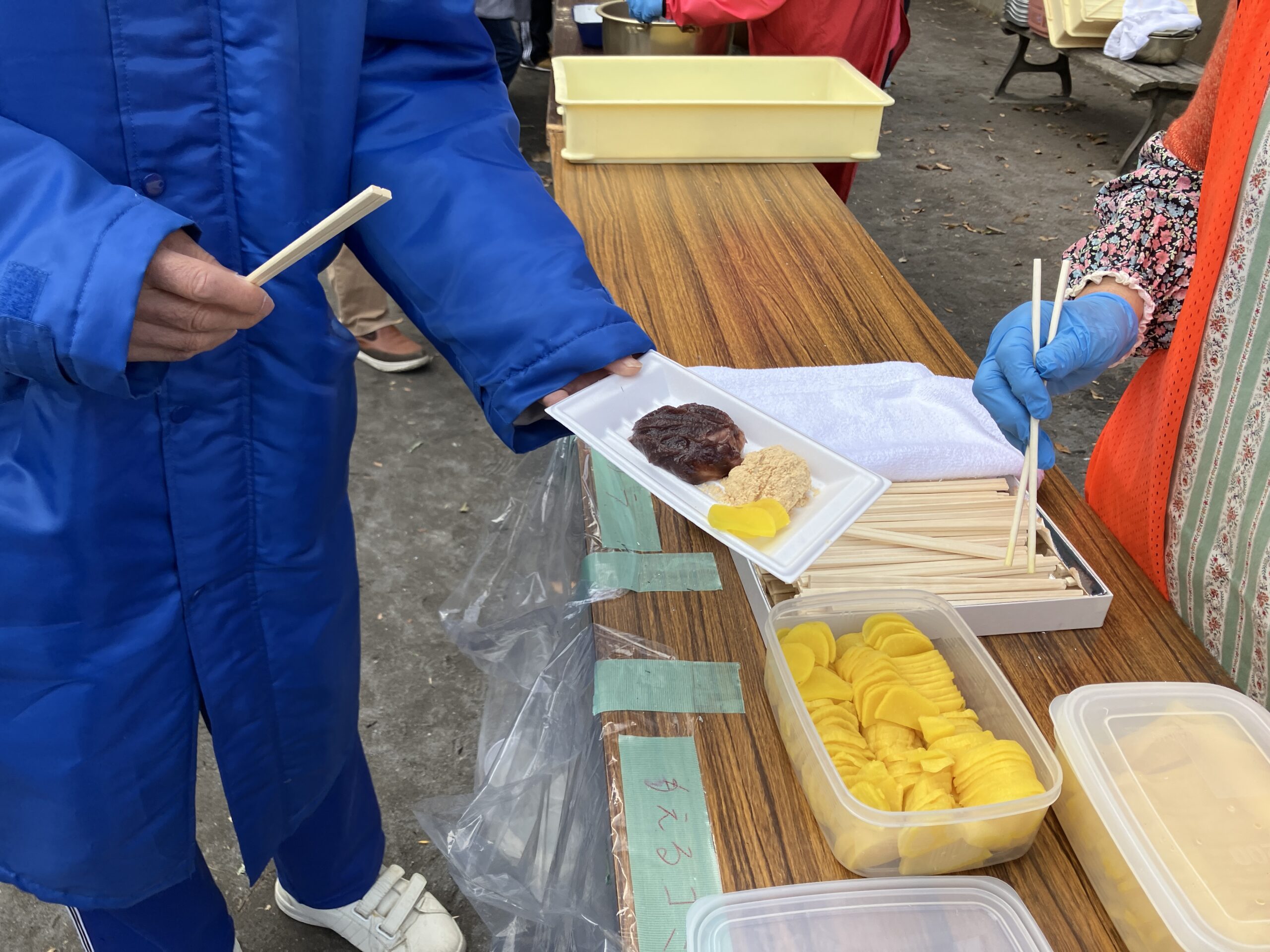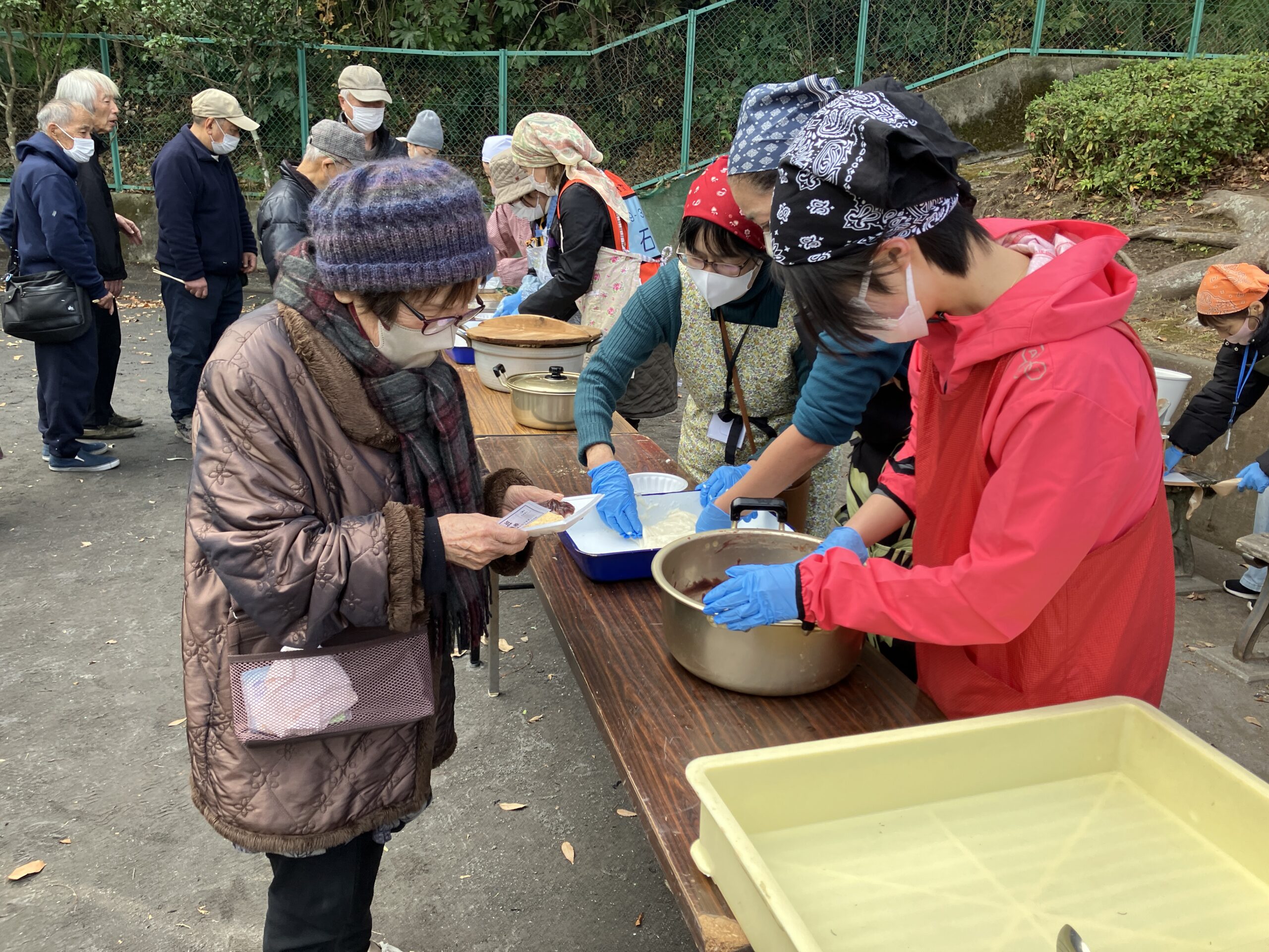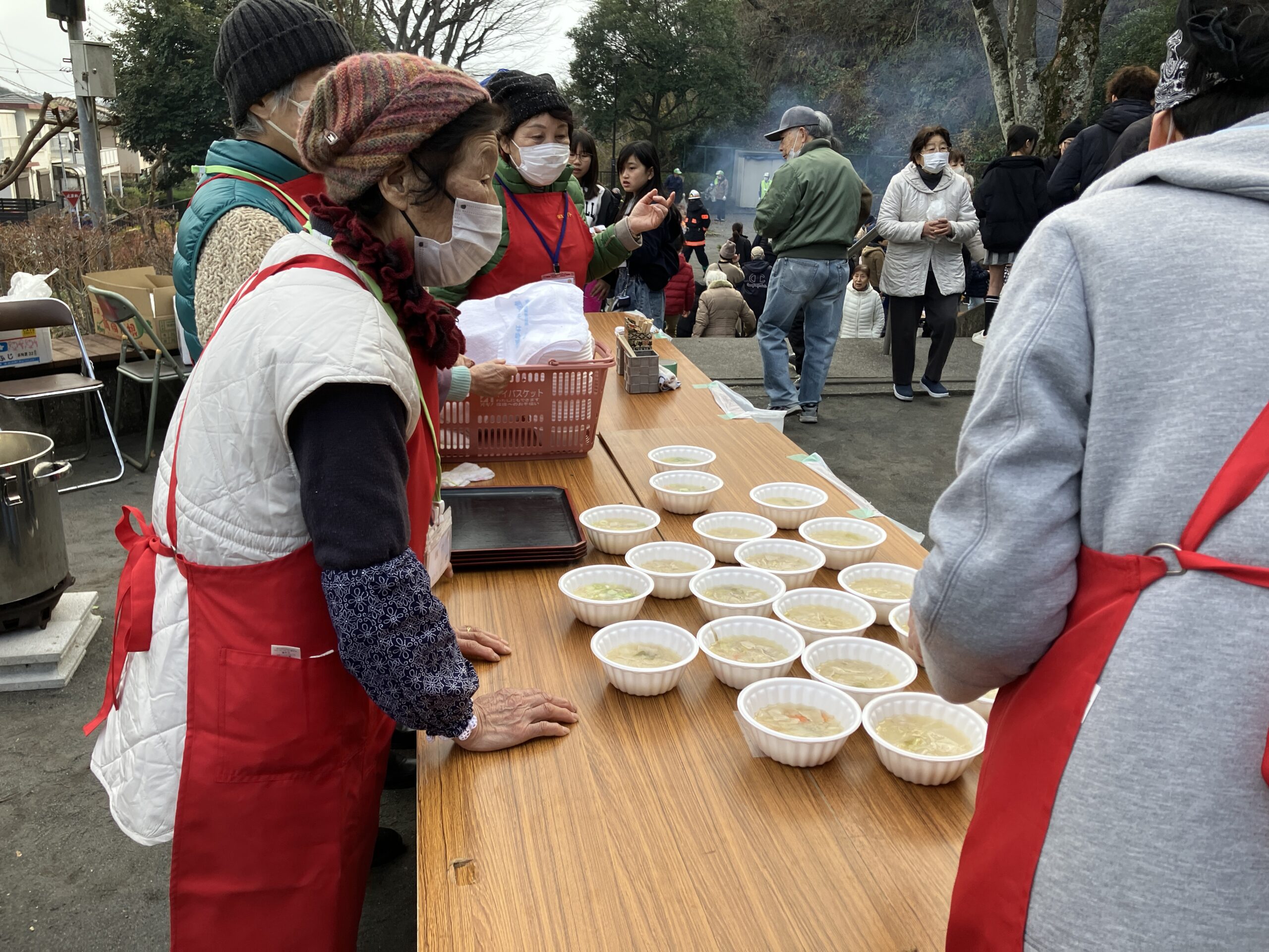 お焚き上げの後には、お神酒でお清めをした後、きな粉餅、あんころ餅、そして湯気の立つ豚汁が振る舞われました。冷たい風にさらされた体に、その温もりがじんわりと染み込んでいきました。自然と行列ができ、言葉を交わしながら箸を動かす光景を眺めているうちに、正月行事の本当の意義は「食べること」そのものよりも、足を運んで集まり、「一緒に過ごすこと」にあるのだと感じました。