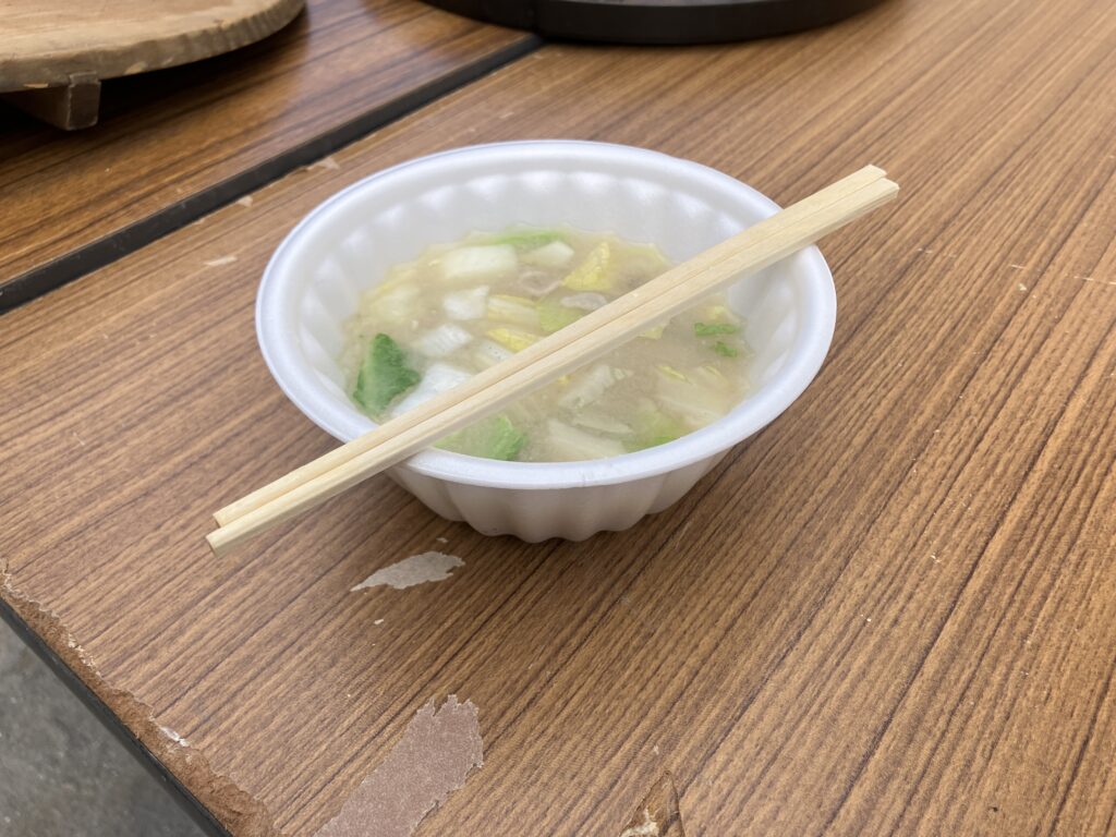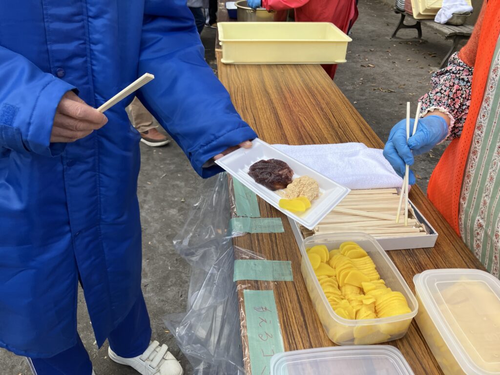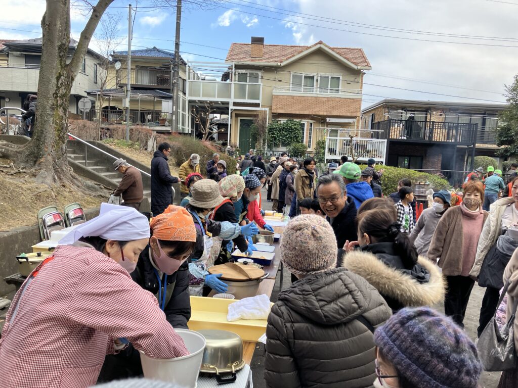 お焚き上げの後には、きな粉餅、あんころ餅や、湯気の立つ豚汁が振る舞われました。冷たい風にさらされた体に、その温もりがじんわりと染み込んでいきました。自然と行列ができ言葉を交わしながら箸を動かす光景に、正月行事の本当の意味は「食べること」そのものよりも、足を運んで集まり「一緒に過ごすこと」にあるのだと感じました。