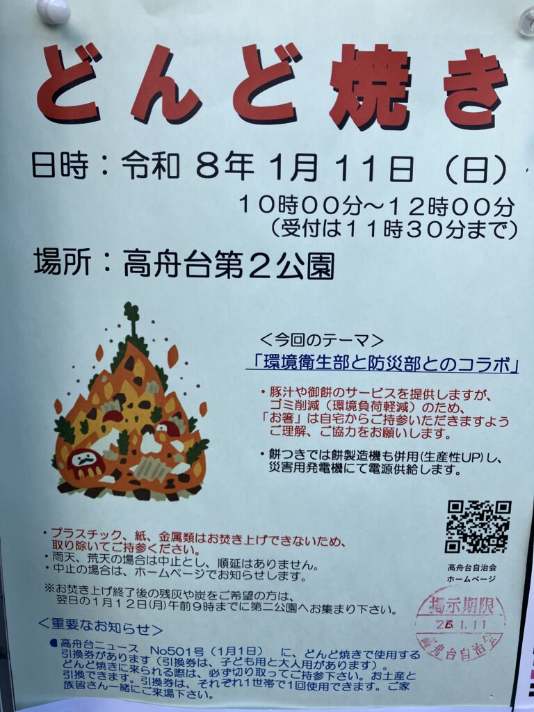 高舟台第2公園で行われましたどんど焼きに参加しました。かなりの強風が吹いていましたが、近隣の消防団の方々が見守る中、門松や松飾りのお焚き上げは無事に、滞りなく行われました。炎は風にあおられながらもどこか清らかで、古い年を送り、新しい年を迎えるための儀式として、静かな緊張感と温かさが同居しているように感じられました。